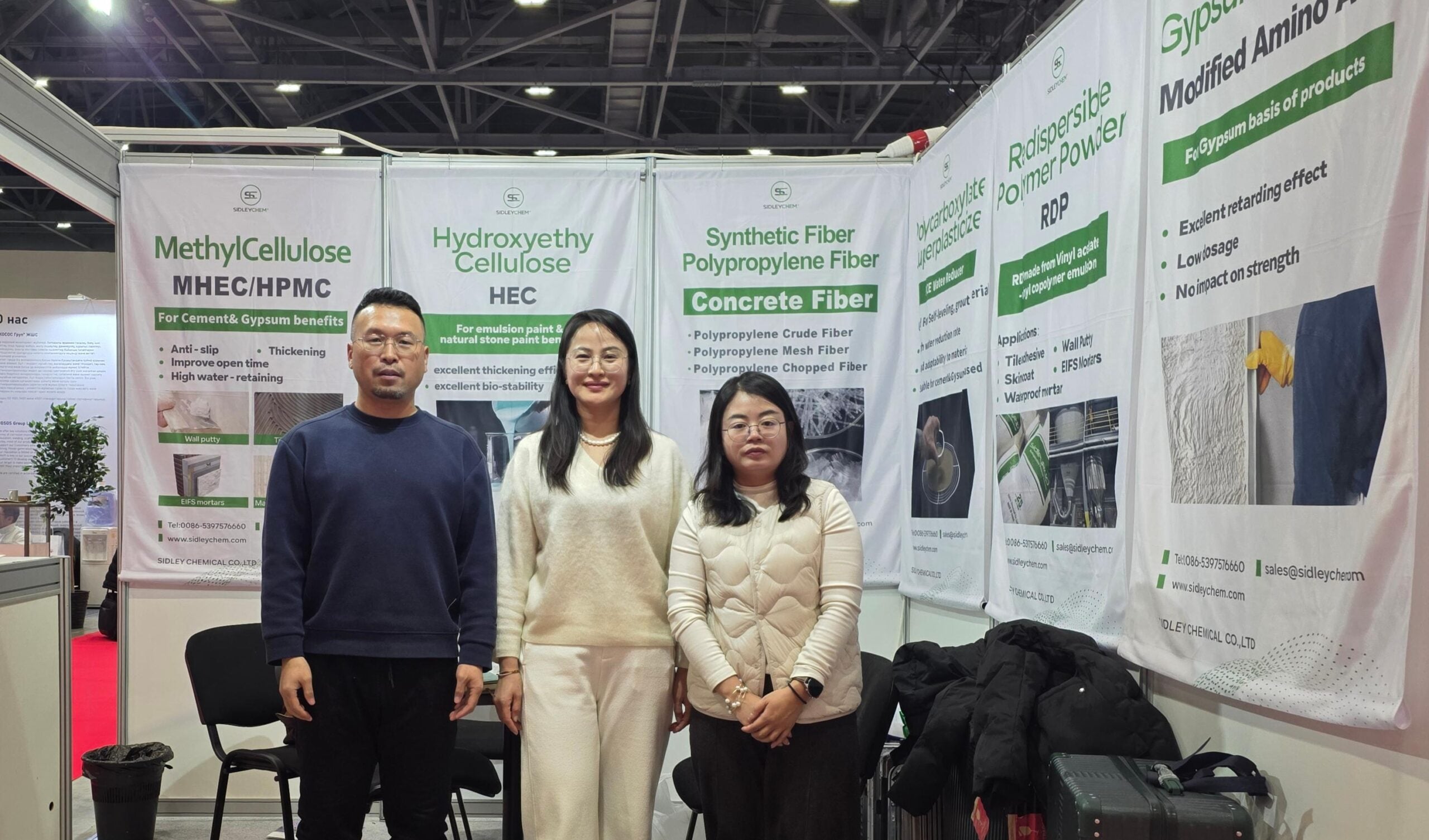 At the strategically designed 9 sqm double-opening Booth A52, SidleyChem’s technical experts presented a comprehensive range of high-performance additives specifically formulated for the Central Asian market. The showcased portfolio, which attracted keen interest from ready-mix plants, formulators, and contractors, included: